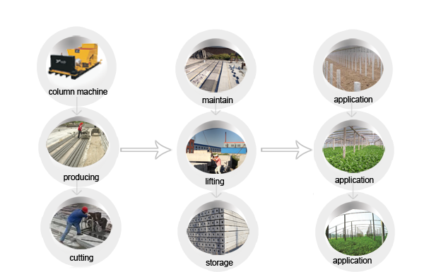 Cleaning the producing bed→ painting parting agent→ distribute steel wire and fix→tensioning the steel wire→ mix and transportation of concrete → slab molding →make testing block→ covering and curing →testing block intensity →relief the steel wire→ cutting slab→ storage