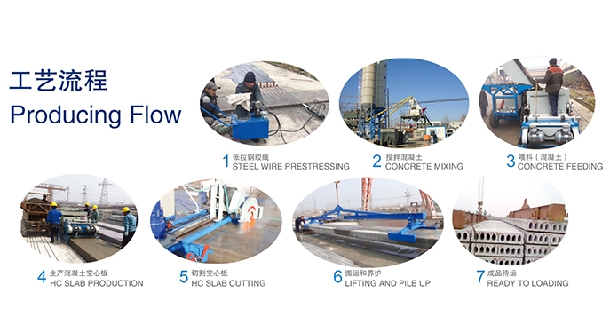 During production prestressed reinforcement is to be placed on the platform first and stretchingis done on it according to the standard, then adjust the plug extruder in readycondition, feed the necessary concrete into the hopper of the extruder, after aprocessing of consolidation and high frequency jolt ramming, cored slab is come into being and through curing, gradual tension force relief, the slab can becut into desired size and stored.